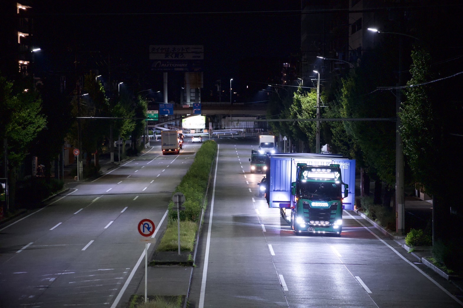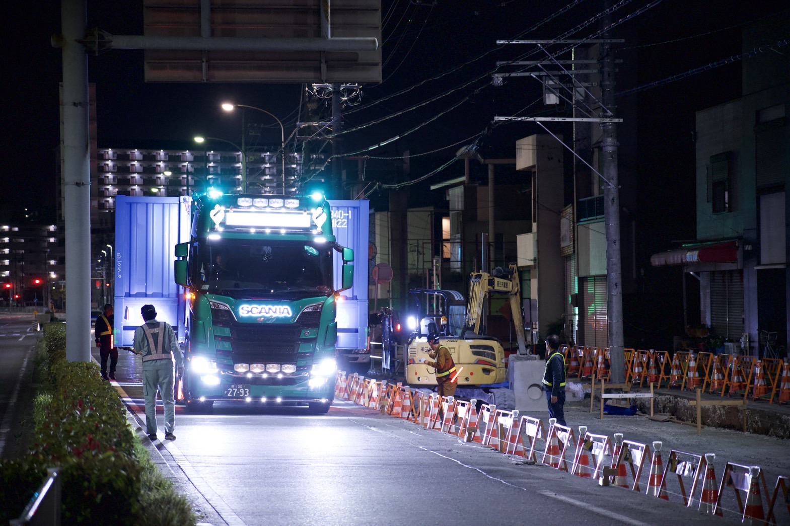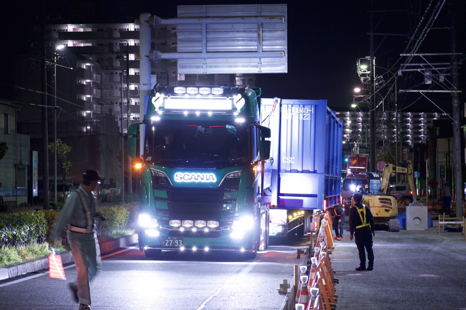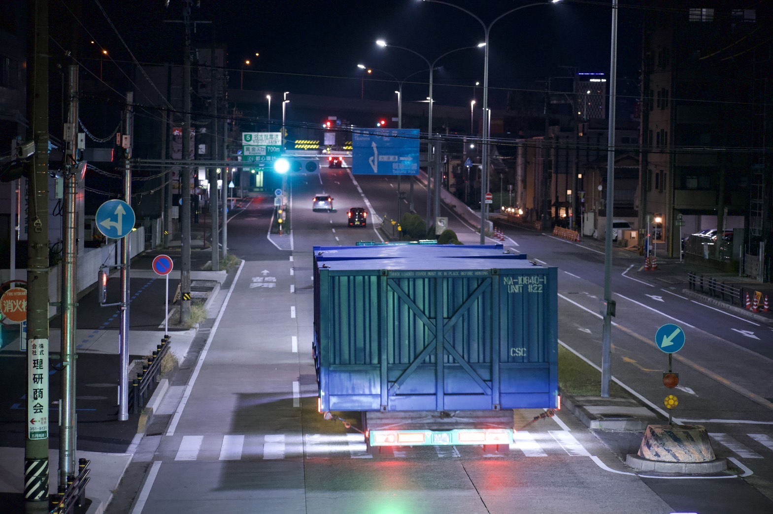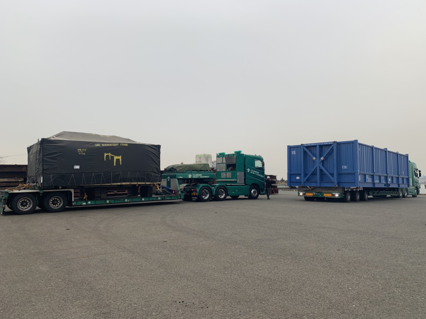 幅5メートルの特殊コンテナを道路2車線を使い輸送しました。 途中、道路工事による車線規制で1車線しかない場所がありましたが、事前に工事業者様と 打合せを行い、現場監督様のご協力もあり無事に通過することが出来ました。